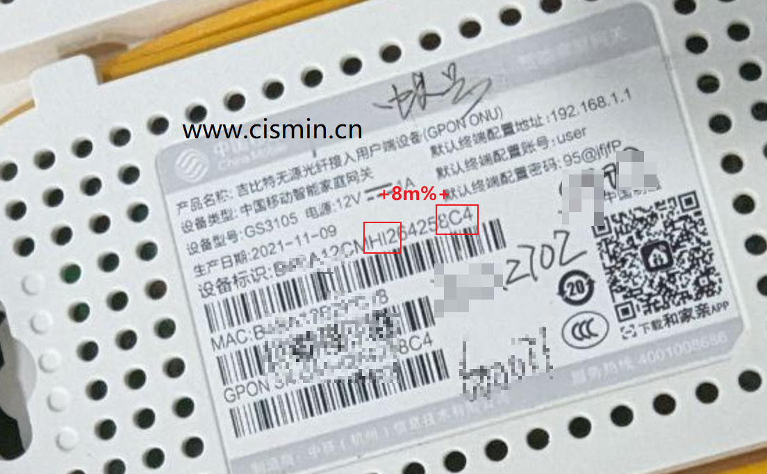 湖南移动光猫GS3105管理员账号和密码是多少? 2023-11-10添乐 添乐 管理员 关注 224文章 0粉丝 电脑网络评论1,191 刚安装宽带的时候,安装人员设置的是光猫PPPOE拨号上网,可能会有些影响网速。 购买的网件R7000路由器性能会更好一点,于是想进入光猫修改连接模式为桥接模式。 在网上找了很久的管理员密码,最终在恩山论坛找到了。 管理员账号:CMCCAdmin 管理员密码:密码的组成:设备标志的第9、10、11+8m%+末尾3位 上面的密码就是:HI28m%8C4 你弄明白了吗? 以下为: 美国NETGEAR网件R7000购于2018年 点赞 登录收藏 https://www.chaolen.com/610.html 复制链接 复制链接